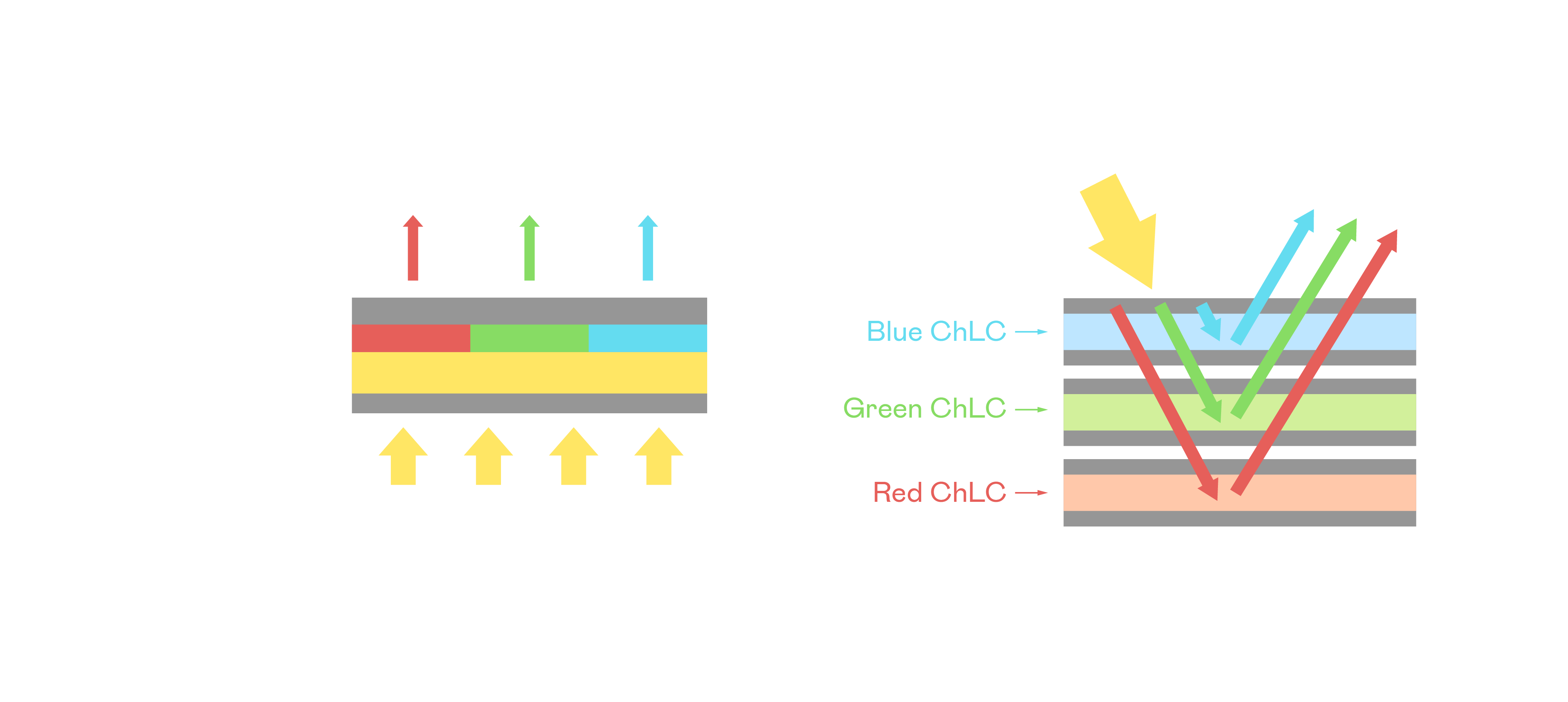 佰富彩膽固醇液晶顯示器是由紅、綠、藍三層膽固醇液晶面板堆疊而成,並採用無彩色濾光片設計,減少環境光在反射過程中的損耗。